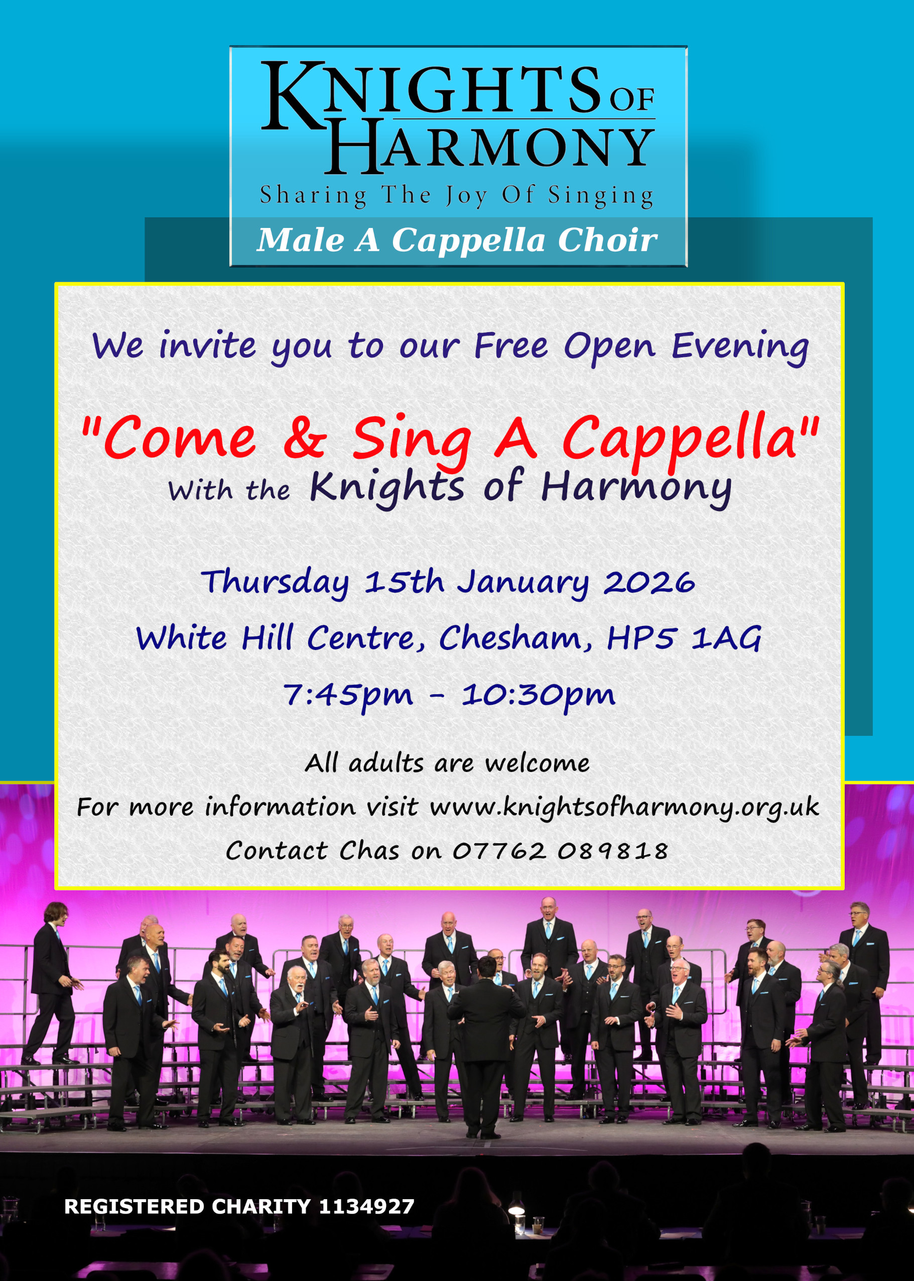 Join the Knights at the Elgiva theatre in Chesham with fantastic guest quartets Limelight and Spice Report, to celebrate 50 years of a cappella singing in our area. Tickets are on sale from the Elgiva website. A beautiful close harmony sound that will lift your spirits, make you laugh and move you to tears...-Saturday 4th October -